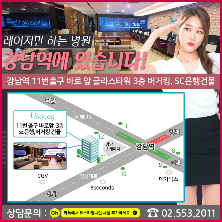 종아리레이저제모가격에 대해 알아봤다면 이제는 병원의 접근성에 대해서도 알아볼게요. 유스타일나인은 강남역 11번 출구로 나오면 바로 보이는 글라스타워 3층에 위치해 있는데요. 시술시간이 30분 내외로 짧고 원스탑 관리가 가능하기 때문에 퇴근후나 약속전 잠시 방문하셔서 시술받고가시면 되겠죠?