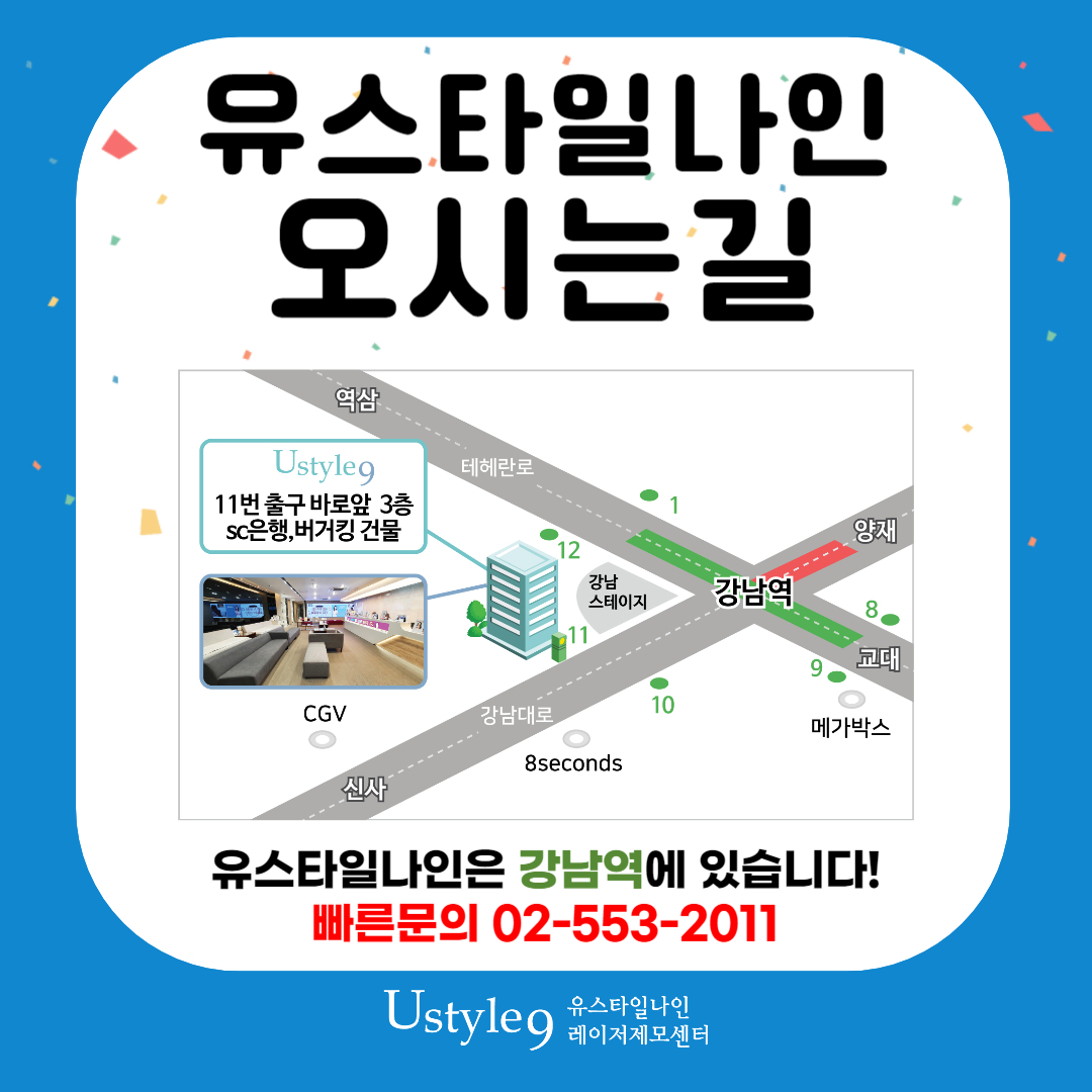 레이저제모만 하는 유스타일나인은 강남역 11번 출구 바로 앞에 있어 언제든지 편하게 방문하셔서 상담받아보시고 시술받아보실수있답니다. 또 평일 야간진료를 통해서 하루 일과가 끝나고, 혹은 퇴근 하고 많은 분들이 방문하시기때문에 더욱 편하게 방문하시길 바랍니다.