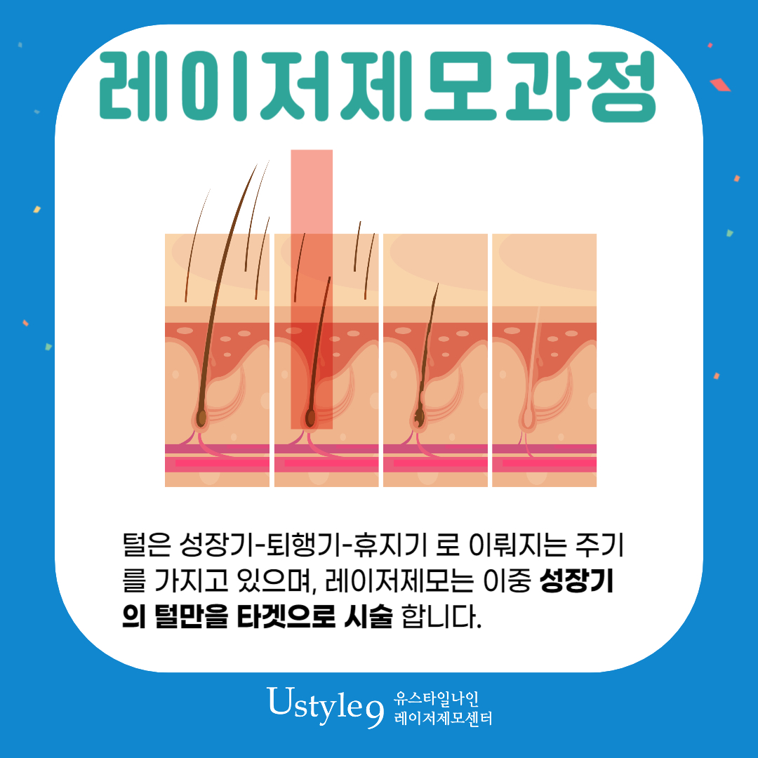 배제모는 평균적으로 약 7~8회 이상의 시술횟수가 필요하며, 한달에 한번씩 충분히 시술이 진행되어야 제대로된 레이저제모를 받았다고 할 수 있습니다. 털은 성장주기를 가지고있는데 이중에서 성장기의 털을 타겟으로 레이저제모를 진행하고있는데, 이 주기가 약 한달에 한번정도이기때문에 시술주기가 평균 4주~6주 정도마다 한번씩 받아주시는것을 권장해드리고있습니다.
