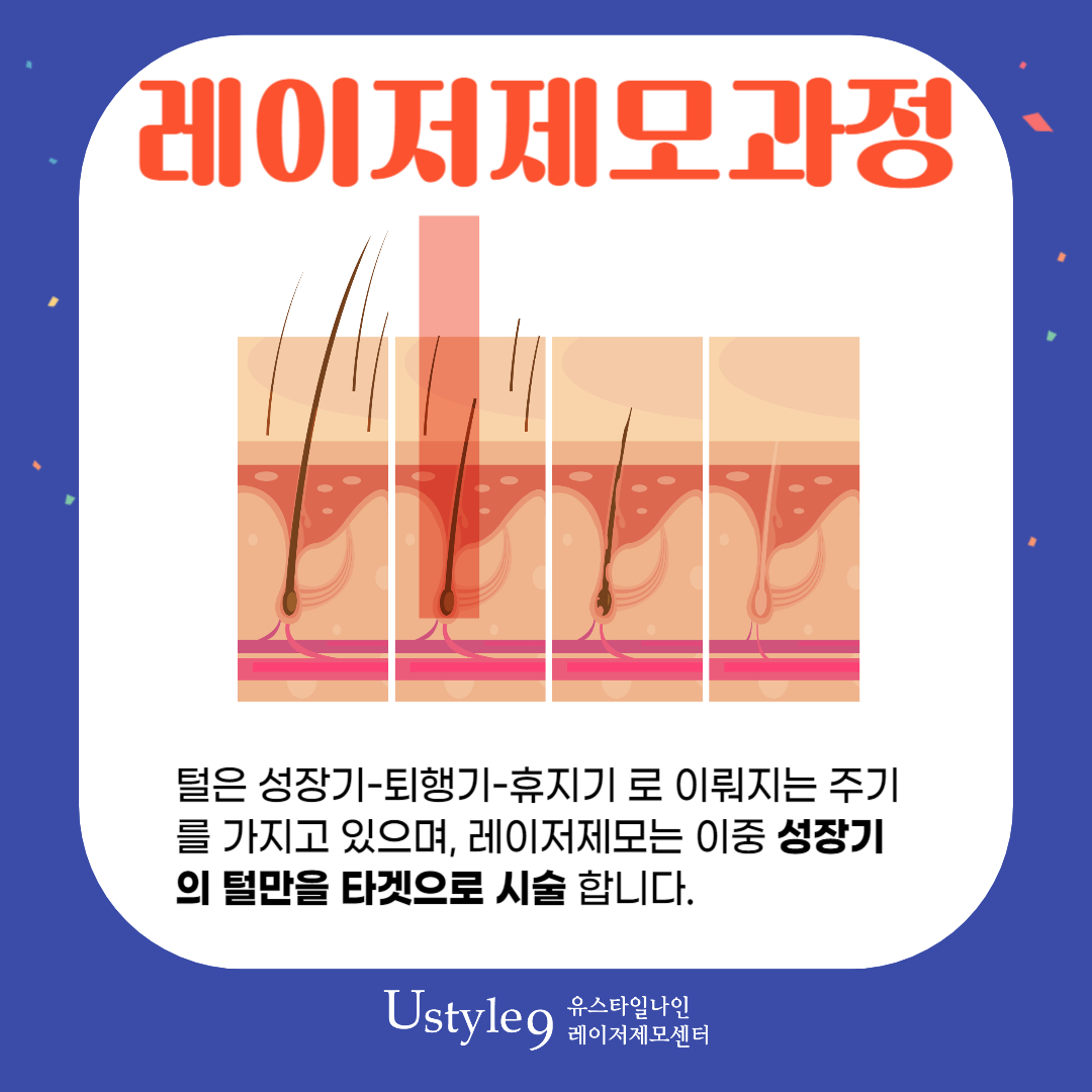 사람의 털은 성장기,퇴행기,휴지기를 거치면서 자라고 탈락하길 반봅합니다. 레이저제모는 이중에서 성장기의 털에 작용이되는 시술로, 성장기의 털에 작용된 레이저에너지가 모근과 모낭까지 파괴시킬수있기때문입니다. 즉, 레이저제모는 털을 자라게하는 근원적인 부분을 제거해서 털이 자라지못하도록하는것이라고 할수있는데요. 그래서 유일하게 영구적인 관리가 가능한 방법이기도합니다.