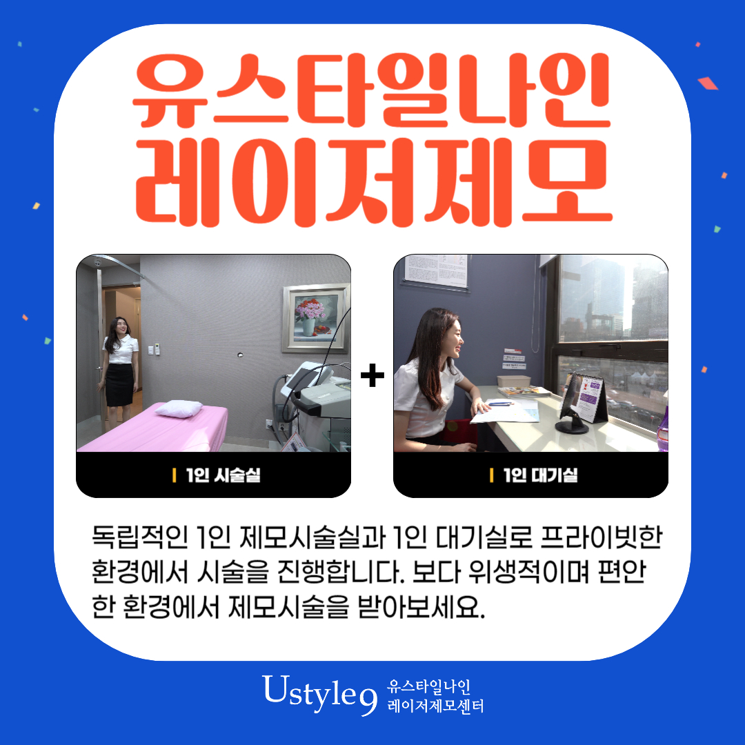 아무래도 교대제모 레이저 시술을 받으실때 공장형이라고 불리는 시스템에서 받길 꺼려하시는 분들도 계신데요. 유스타일나인은 모든 대기실과 시술실이 1인실로 구성되어있습니다. 위생은 물론 프라이버시 까지 고려한 시스템에서 편하게 시술을 받아보실수 있고, 또한 의료진이 면도부터 도와드리고, 시술복도 제공해 드리기때문에 언제든지 편하게 방문만 해주시면 됩니다.