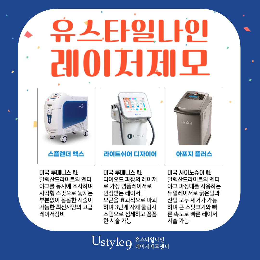 게다가 유스타일나인에서는 의료진의 경험과 함께 다양한 고성능 레이저가 많은 병원인데요. 국내에 최근에 도입되기 시작한 스플렌더 엑스부터 라이트 쉬어 디자이어, 클라리티2, 아포지 플러스 등등 다양한 장비들로 한가지 레이저만 사용하기 보다는 다른 파장의 레이저를 적절하게 조합해서 시술하여 좀 더 제모효과를 높이고 있죠!