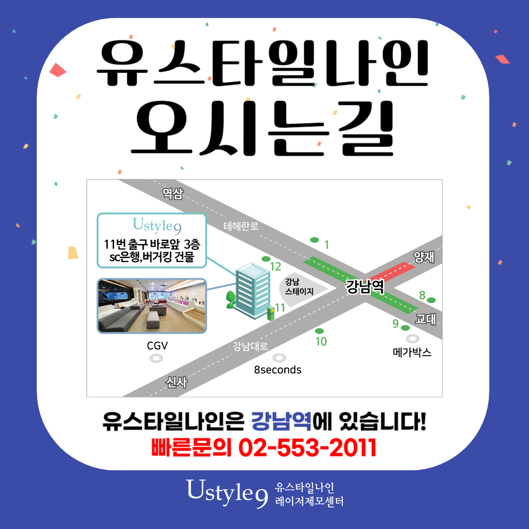 유스타일나인은 서울에서도 미용의 메카로 잘 알려진 강남에 위치해 있어요~ 찾기 힘들지도 않고 강남역 11번 출구에서 나오자마자 보이는 글라스타워 3층으로 오시면 되서 이용이 더욱 편하죠! 현재 다양한 제모이벤트 진행하고 있는데, 자세한 상담 받아보면 어떨까요?