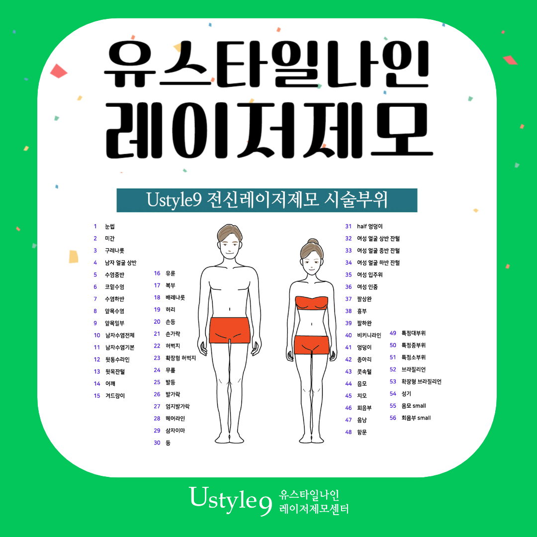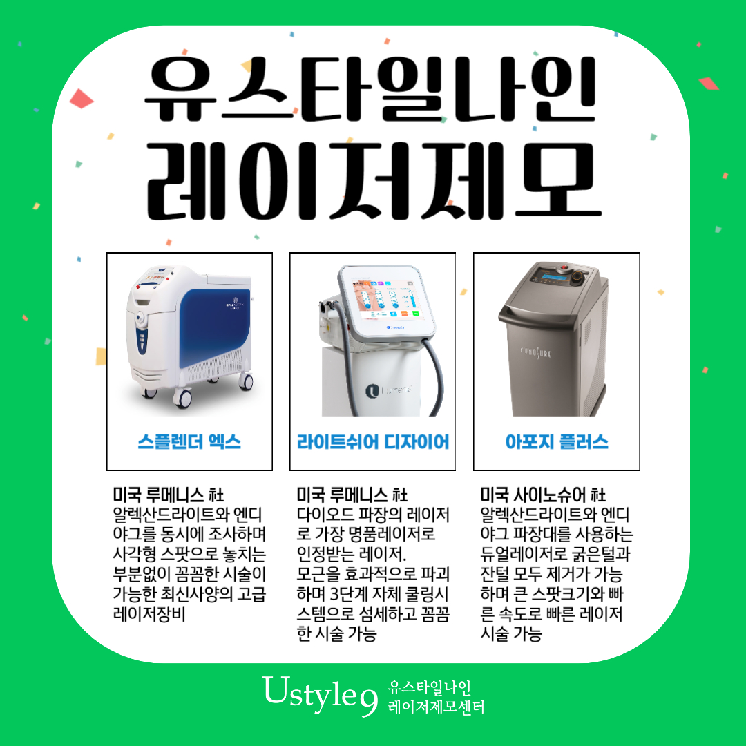 이렇게 레이저제모로 하는 배털제모를 찾고 계신다면 유스타일나인을 추천드리고 싶습니다. 유스타일나인은 레이저제모 한가지만을 연구하고 시술하는 곳으로, 경험이 풍부한 베테랑 의료진이 직접 개개인의 털과 피부의 상태를 확인한 뒤 시술을 진행하며, 면도부터 시술 직후 쿨링 및 진정케어까지 체계적으로 진행합니다. 또한 다양한 제모전용 레이저기기가 준비되어 있어 제모 부위별 맞춤 사용으로 더욱 효과적인 시술이 가능합니다.