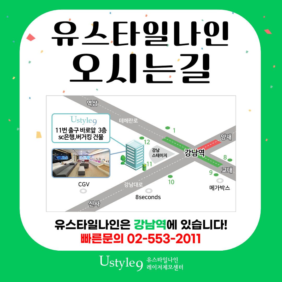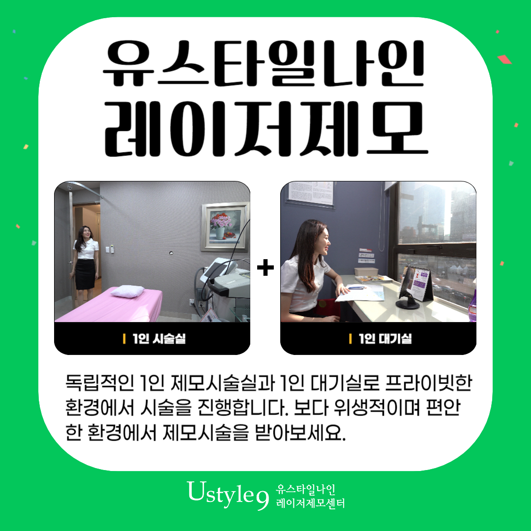 이 뿐만 아니라 1인 대기실 및 시술실로 프라이빗한 환경을 제공하고있어 보다 위생적이고 편안한 환경에서 제모시술을 받아보실수있습니다. 제모만을 위한 서비스와 시스템이 갖추어져 있어 레이저제모가 처음이신 분들도 부담없이 제모를 시작하실 수 있습니다. 놓치기 쉬운 부위였던 배털제모, 강남역 11번 출구 바로 앞에 위치한 유스타일나인에서 깔끔하게 관리하는 것은 어떨까요?