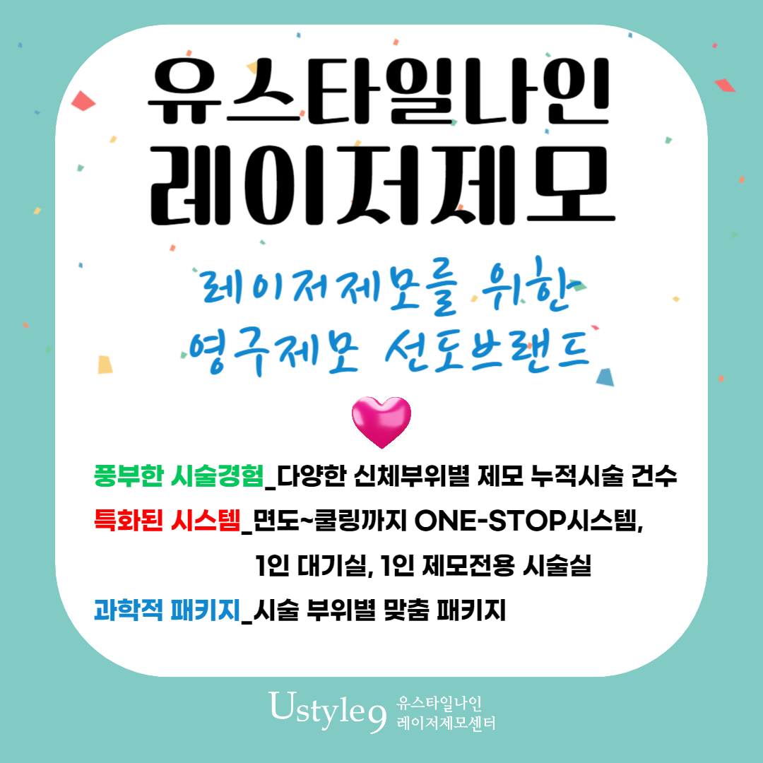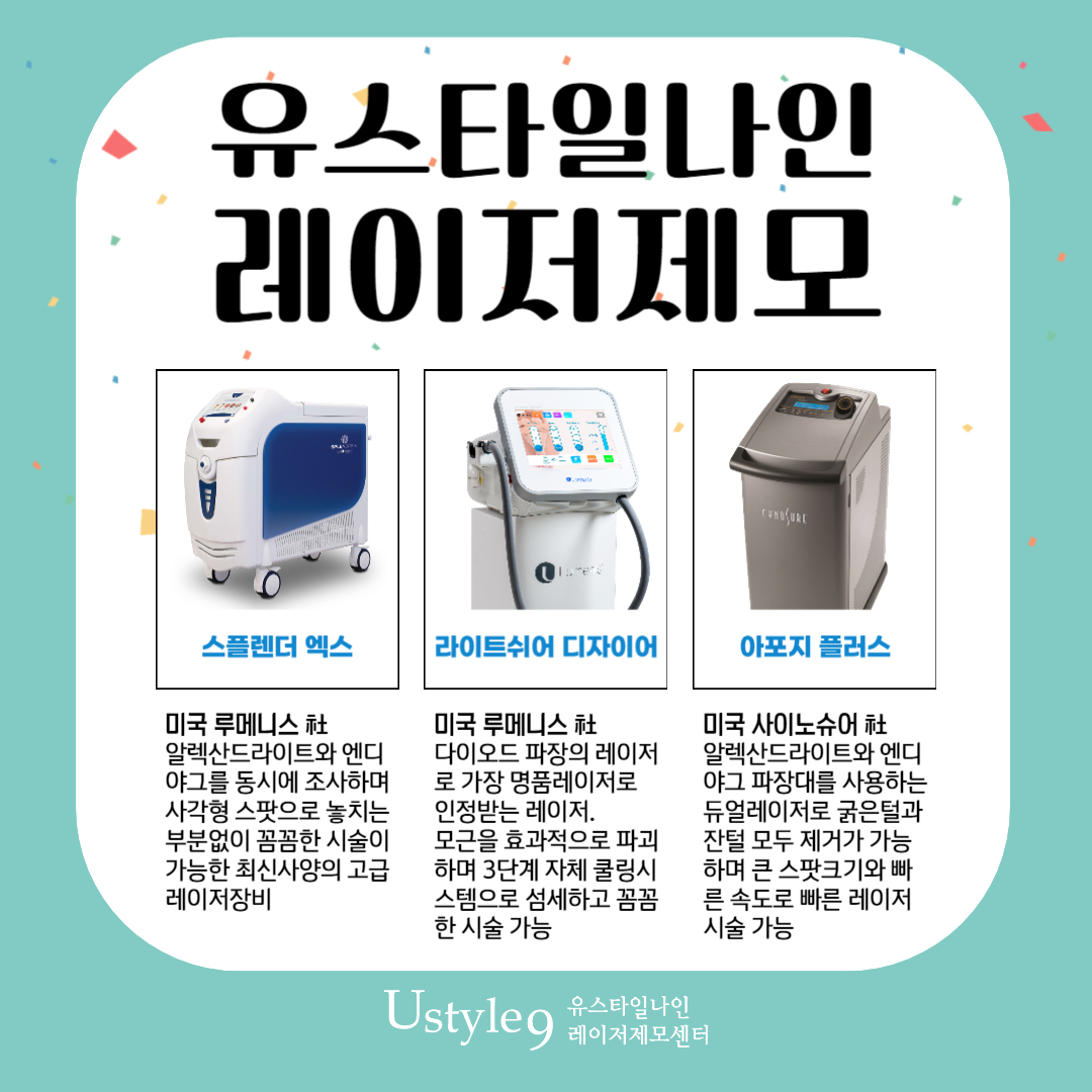 또한 유스타일나인에서는 다양한 제모장비를 사용하고 있습니다. 한두가지만의 장비가 아니라 여러파장대의 레이저장비를 사용하여 개개인의 피부타입과 털 상태에 맞춘 일대일 맞춤형 제모시술 시스템으로 효과적인 제모결과를 보여드리고 있습니다. 최신고사양의 레이저제모 장비 중 최초로 사각형 레이저스팟을 도입한 스플렌더엑스를 비롯하여 라이트쉬어디자이어, 클라리티2, 아포지플러스 등 다양한 레이저파장대의 제모전용장비로 맞춤형 시술을 받아보세요!