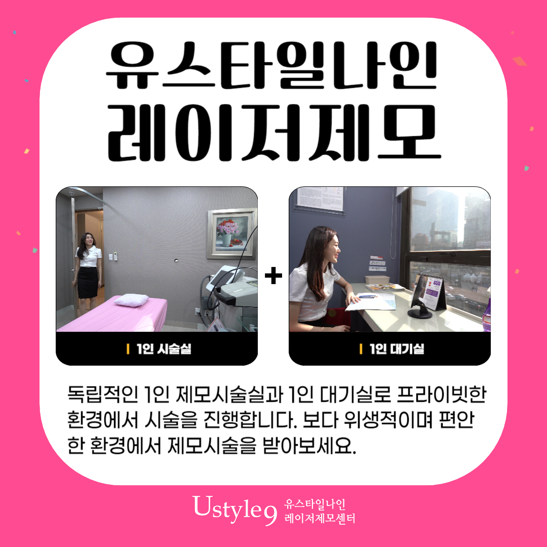 아무래도 항문레이저제모는 하의를 탈의하고 시술에 들어가다보니 프라이버시가 생명인것 같아요. 유스타일나인은 어떤 부위를 제모하든 이미 남/여 분리된 1인 대기실을 운영하고 있는데요. 그렇기 때문에 다른사람과의 동선을 줄일 수 있답니다. 또한 시술실 역시 1인 제모시술실로 운영되기 때문에 다른사람의 신경은 쓰지 않고 위생적이며 편한 환경에서 레이저제모에만 집중을 받을 수 있어요.
