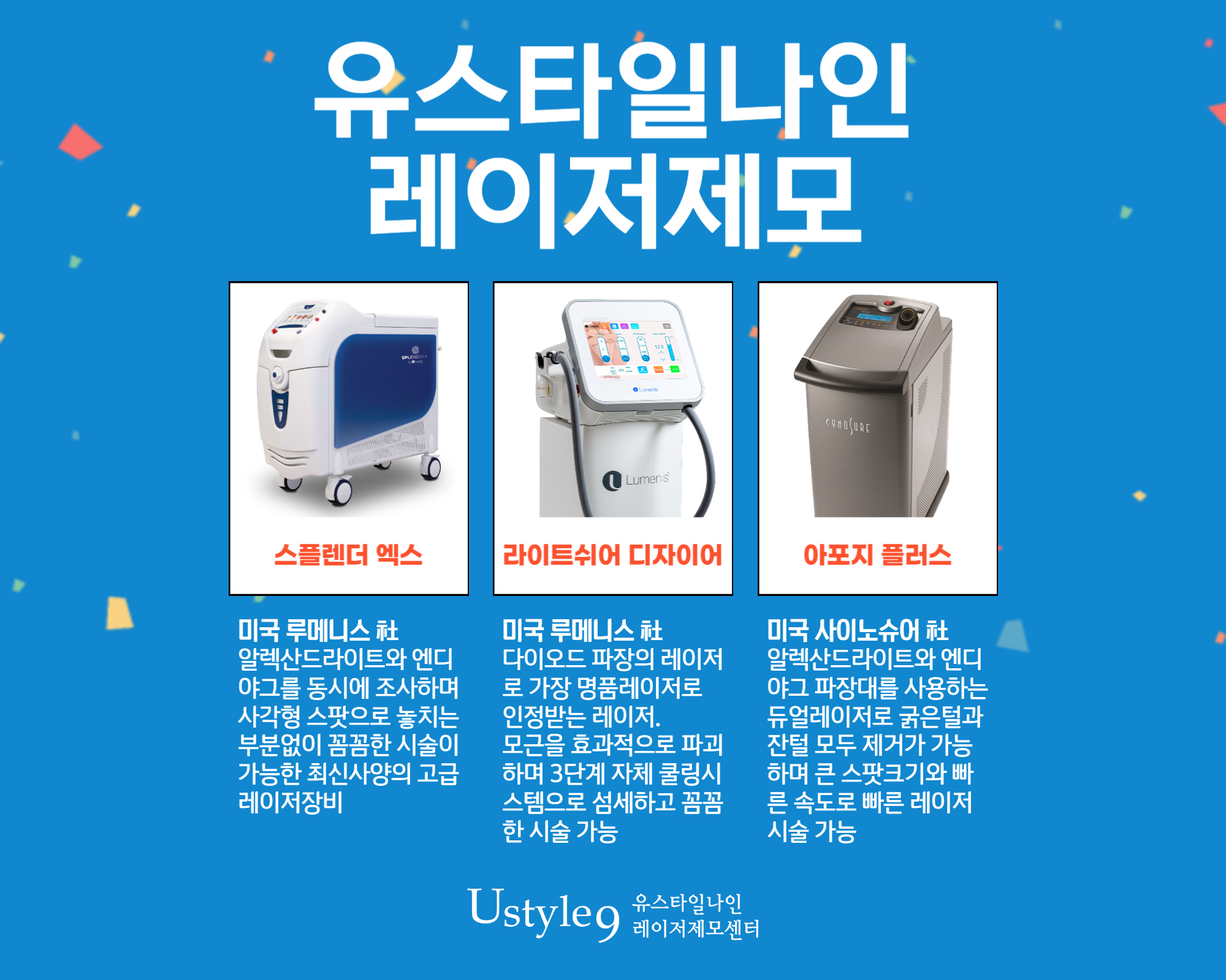 피부상태에 맞춰 레이저 종류를 선택하고 시술 속도나 깊이, 시간 등을 조절해야 완성도 높은 제모 결과를 볼 수 있습니다.유스타일나인은 깊숙한 모낭까지 제모를 할 수 있는 레이저부터 여러 듀얼파장의 레이저들과 이번에 새로 국내 도입된 동시 듀얼파장의 레이저까지 다양한 장비를 갖추고 있숩니다. 게다가 미용의 메카 강남에서도 오랜시간동안 레이저제모를 해 온 병원이라 어마어마한 시술케이스가 축적된 곳이죠.