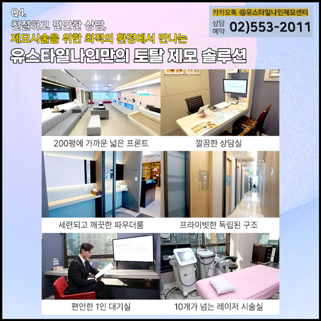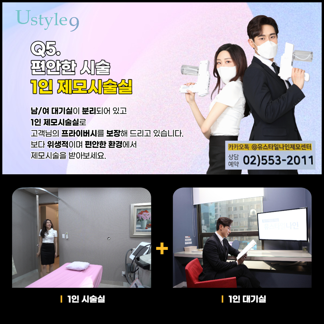 또한 유스타일나인에서는 1인 대기실과 1인 시술실로 보다 프라이빗하고 위생적인 환경을 제공합니다. 다른 사람들고ㅏ 한공간에서 커튼으로만 가림막이 되어있는것이 사실 불편할수있습니다. 아예 독립적인 공간에서 편안하게 시술을 받아보실 수 있다면 훨씬 편하게 제모시술을 받아보실수있겠죠?