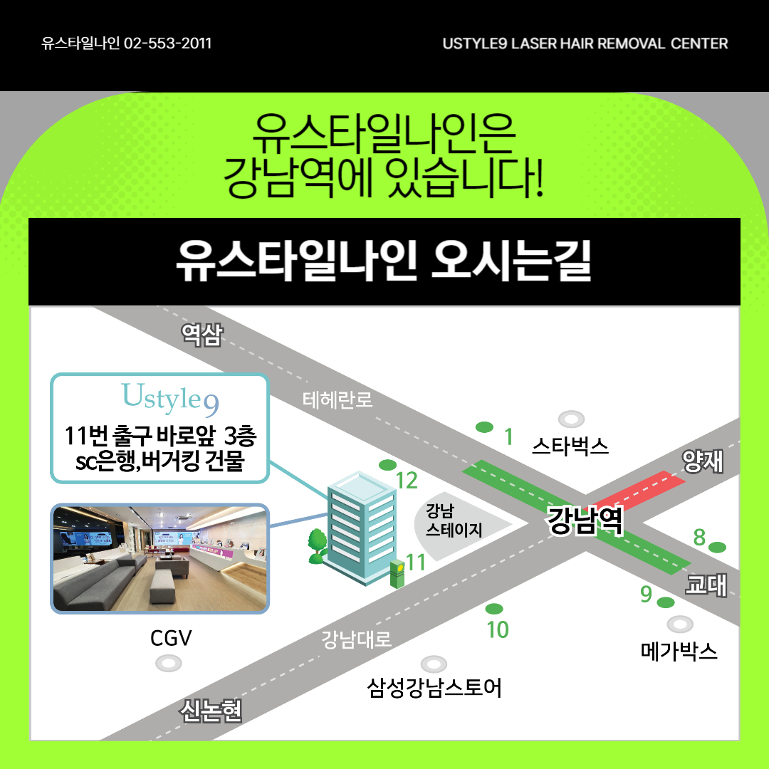 유스타일나인 레이저제모센터는 강남역11번 출구 바로앞에 위치한 곳으로 다양한 시술과목 중 레이저제모를 같이하는 곳이 아니라 레이저제모만을 전문적으로 시술하는 곳입니다. 그만큼 레이저제모에 진심인 곳이라 할 수 있는데요. 전문성을 갖춘만큼 시스텥ㅁ도 체계적으로 운영되고 있습니다.