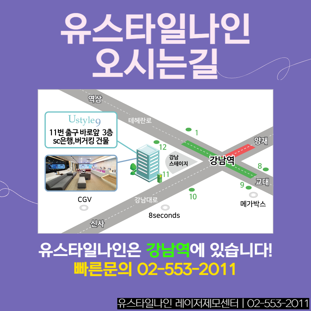 강남역11번출구 바로앞에 있는 레이저제모만 시술하는 유스타일나인에서 좁은이마제모를 통해 시원한 인상 늘 깨끗하게 정돈된 라인으로 편하게 관리해보세요~!