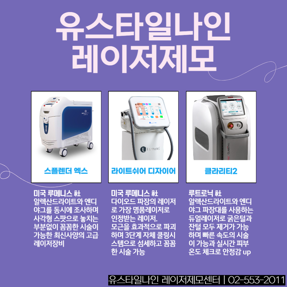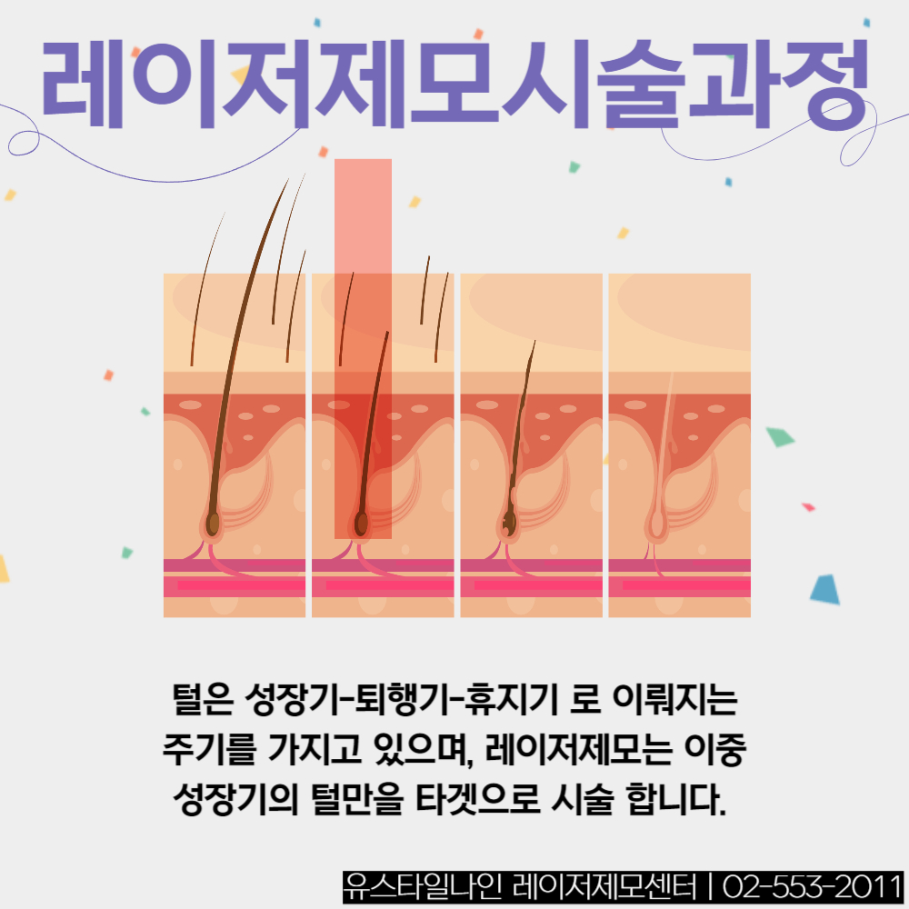 그래서 이런 불편함과 부작용에서 벗어난 방법으로 찾는 것이 레이저로 하는 방법입니다. 왁싱이나 면도처럼 피부에 직접적으로 자극을주며털을 없애는 방법과는 다르게 피부 속에 레이저를 조사하여 털이 자라는 모낭만을 완전히 파괴하여 털이 자라나지 않게 만드는 시술로털이 자라는 근본적인 원인을 제거함으로써 안전하게 반영구적인 제모효과를 누릴수 있는 방법이에요.