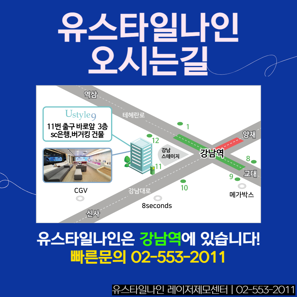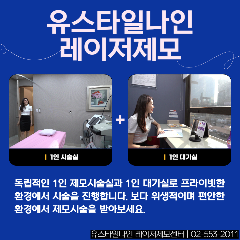 유스타일나인은 레이저제모만을 한자리에서 오랜기간 시술해온 곳 입니다. 시술전 의료진이 직접 면도를 해주며 고객의 피부와 털상태에 맞는 맞춤형 레이저제모를 제공하는 것은 물론 누구의 방해를 받지 않고 대기하고 시술받을 수 있는 1인전용 제모대기실 과 제모시술실로 편안한 제모가 가능합니다. 브라질리언제모에 관심은 많지만 민망함과 불편함, 어디서 해야할지 모를 막막함에 답답했다면 강남역11번출구 바로앞에있는 유스타일나인에서 답답한마음을 달래보시기 바랍니다.