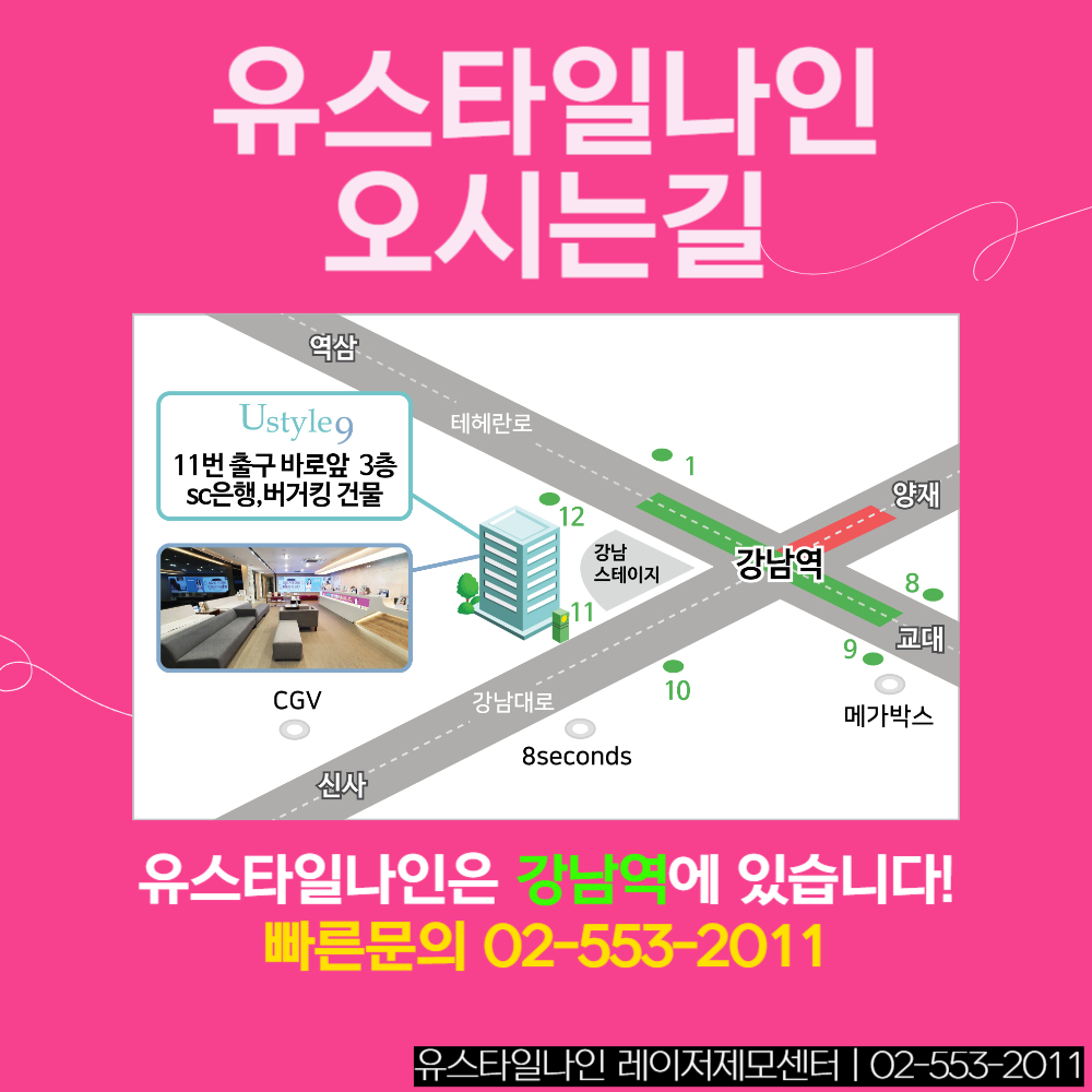 게다가 서울에서도 유동인구수가 많은 미용의 메카 강남에 위치해 있는데요. 병원이 어딨나~ 안보이네 하며 찾으러 다니지 않아서 더 좋은거 같아요. 강남역 11번 출구 바로 앞 버거킹이 있는 건물 글라스타워 3층으로 오시면 빠르게 도착하시는데요. 계절마다 비가 오거나 눈이 와서 이동하기 불편할 때도 정말 좋더라구요. 여자브라질리언제모에 대해 자세한 제모상담 원하시는 분들은 아래의 상담문의 배너를 클릭해 주세요~^^